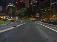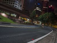 A stunning night view of a modern urban cityscape with towering skyscrapers, illuminated street lights, and a road surface leading through the city.