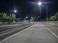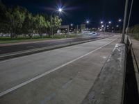 A straight road illuminated by street lights and headlamps, with clear sky and city buildings in the background. The urban design showcases the concrete street and infrastructure, while security lighting and elevated tree vegetation add to the overall scenery.