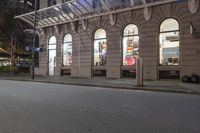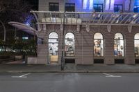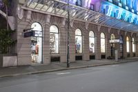 the corner of an empty building has windows lit with brightly lit lights on it's side
