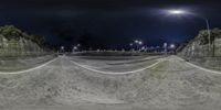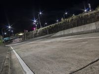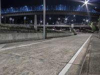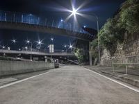A stunning view of a city at night, with a bridge and underpass illuminated by street lights. The road surface, made of asphalt, leads straight down the road, surrounded by trees and vegetation. The urban design is enhanced by the light from the street lights, creating a beautiful contrast against the clear sky and artificial light. The dark tar of the road reflects the midnight glow, while floodlights highlight the railway track and rolling urban infrastructure.