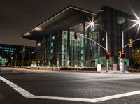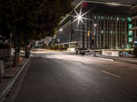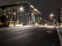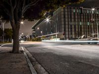 A view of the urban city life in Long Beach, California, USA, with modern architecture, office buildings, and street lights illuminating the dark night. The grey sky adds a gloomy atmosphere to the cityscape. The light streaks from passing cars create a sense of motion blur on the road surface. The high-rise buildings and vegetation provide a contrast to the open space and residential areas. The city's infrastructure, including roads, curbs, and stoplights, is visible, showcasing the urban design and artificial light in this metropolis.