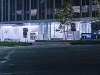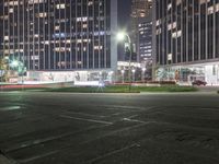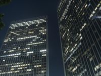 a couple of tall buildings that are lit up at night as seen from the ground