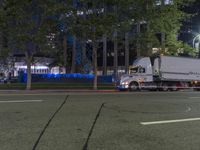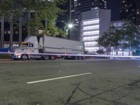 a white semi truck traveling down the street at night in a city setting that seems to be turning left