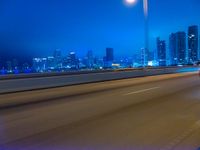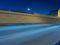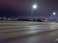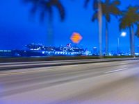 A dark and gloomy night in Miami Beach, Florida, USA, with streaks of light from street lights illuminating the urban landscape.