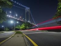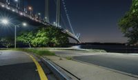 A stunning view of New York City at night, showcasing the urban landscape and iconic bridge, with the glistening water of the coastal area in the foreground.
