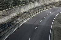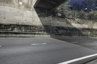 A dark and elevated road surface curves through the city, illuminated by artificial lights and street lights. The straight road leads straight down the cityscape, with buildings and vegetation lining the thoroughfare. The clear night sky and tints of grey create a captivating urban landscape.