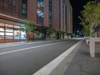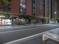 A view of a city at night showing a well-designed urban area with illuminated buildings, shops, and cafes. The cityscape features a road with asphalt surface, street lights, and trees adding to the overall aesthetic.