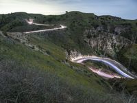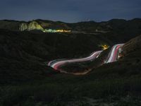 Aerial view of a highland road in California, USA, surrounded by mountains and nature. The dark landscape is illuminated by artificial light, creating light streaks on the elevated road surface. The motion blur captures the sense of speed and adventure on this highway through the mountain pass.