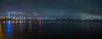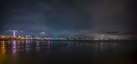 The city of Shenzhen, located in Guangdong, China, is illuminated by artificial light, beautifully reflecting off the coastal water in this nighttime cityscape.