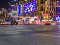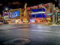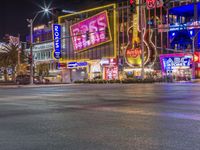 A view of the modern architecture and neon lights of Las Vegas at night.