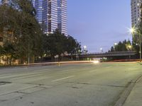 A stunning view of the modern architecture and bustling city life of Los Angeles, California, USA. The brightly lit skyscrapers and streetlights create a beautiful contrast against the clear night sky. The motion blur of passing cars on the asphalt road adds a sense of dynamic energy to the scene.