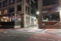 a night time scene with a street intersection with street lights in the background and a manhole