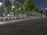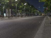 there is a large tree lined sidewalk with some benches on it next to a sidewalk light