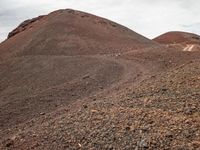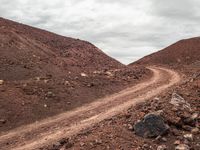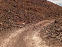 A winding dirt path leads through the rugged mountain landscape, dotted with tree and shrub vegetation, and surrounded by brown and grey sand and gravel surfaces, outcrops and rock formations. The horizon is framed by a cumulus cloud, while the surface is dotted with Aeolian landforms, like makhtesh and hill profiles.