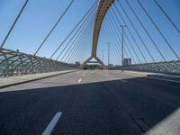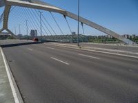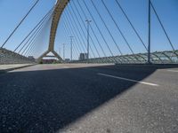 In the heart of Zaragoza, Spain, stands a modern marvel - the iconic One Quarter Bridge. This architectural masterpiece blends seamlessly with the urban landscape, offering stunning views of the city below. The bridge spans across a wide road, casting hard shadows under the clear sky. Its sleek design and straight road create a sense of movement and energy, capturing the essence of city life. A must-see for architecture enthusiasts, this bridge embodies the perfect fusion of modern design and urban aesthetics.