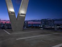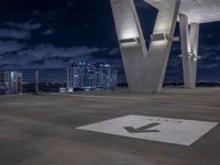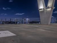 a concrete area with large white and blue buildings in the background at night and a city sky