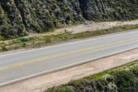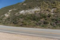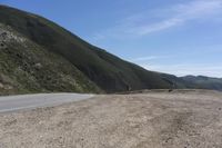 A winding road curves through the wilderness, with a mountain pass, cliffs, and the Pacific Coast Highway providing a route through the highland landscape dotted with trees and clear sky on a sunny day.