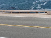 A scenic top down view of the winding Pacific Coast Highway in California, USA. The elevated road surface is lined with an Armco barrier and a guard rail, and is flanked by lush grass, clear skies, and the shore of the Pacific Ocean.