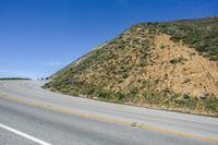 A winding stretch of the Pacific Coast Highway, featuring a controlled access highway with a guard rail, asphalt road, and vegetation, in a highland landscape of mountains and hills in the clear day sky.