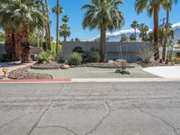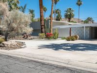 a driveway with cactus and other plants in the front yard area, between palm trees