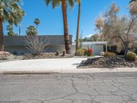 A mid-century modern villa in the suburbs of Palm Springs, California, USA. The home is situated in a residential area with a clear sky, concrete surface and a driveway lined with palm trees. The entry to the property is surrounded by open space and a bush in the Sonora Desert.