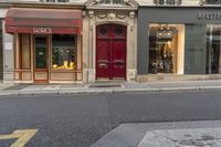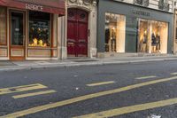 A classic urban design of Paris, France, featuring the contrast between the yellow road surface, red curb, and the architecture of the house and shop facades at the break of day. The infrastructure, materials, and city life provide a unique profile of the European town.