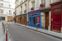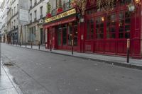 A pink door stands out among the classic architecture of a Paris lane at the break of day. Here, one can find a glimpse of city life, from the bustling cafes and restaurants to the asphalt roads and urban infrastructure that make up the downtown neighborhood.
