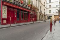 two people on a street with no cars on it in front of a bar with a sign that says private rue de france