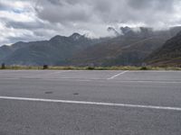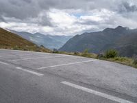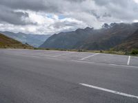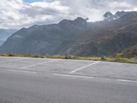 A profile of a parking lot in Austria, Europe on a gloomy day with a grey sky, mountain and open space in the background. Nature and asphalt meet at this packshot.