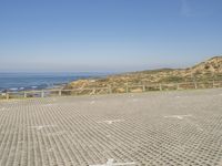 A calm and peaceful parking lot with cobble stone paver, asphalt road surface and lake on one side, beach, wood fence, shore line and clear sky on the other, in Europe's Portugal. The azure water, sandy shore and warmth of the sunlight creates a peaceful and leisure atmosphere at this natural environment.