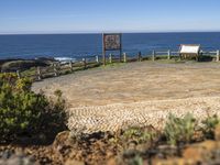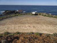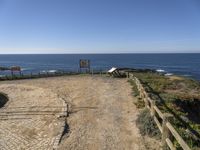 A coastal landscape in Europe featuring a parking lot with a mix of sand, dirt, grass, cobble stone, paver, gravel and a guard rail. The horizon is marked by the azure ocean, clear sky, tall trees and a lake in the foreground. High above, the Armco barrier and shade provide a sense of security from the bright sunlight and waves crashing onto the beach below.