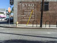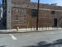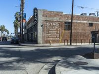 A peaceful dawn reveals a street lined with brick houses and lined with trees in a residential neighborhood in Los Angeles, California, USA. A motor vehicle can be seen in the foreground, parked in front of a property with a brick facade. Other features of the urban design include a tar-covered road surface, street light, fire hydrant, wheel, window, and gas line.
