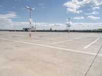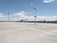 The modern architecture of a factory and warehouse in Berlin, Germany, are visible in the profile of the concrete street below and the open space of the parking deck and garage in the foreground. The clear sky is highlighted by the few white clouds that dot the sky.