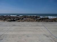 Perched high above Porto, Portugal, the coastal wall offers a breathtaking view of the ocean. The clear sky stretches over the concrete surface, merging with the open space of the beach below. From this elevated position, one can admire the coastline and water expanse, capturing the beauty of Europe's coastal charm from a top-down perspective.