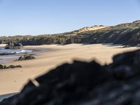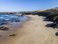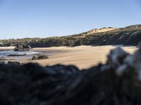 A view of Portugal's coastal landscape with its mountain landforms, open space, beach, shoreline, and azure ocean. The clear sky reveals a hard shadow, while the sunlight casts a warm afterglow over the terrain and surface of the water resources. The foreground reveals a calm lake, wood, and hill, with a mountain in the background, creating an elevated view of the natural environment.
