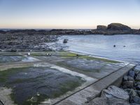 The view of the azure coastline along Portugal's highway at break of day, with the calm water reflecting the afterglow of the moon and the sun in the horizon. The cobble stone road surface and the surrounding mountain landforms creates a peaceful natural environment with trees, grass and wood along the shoreline.