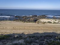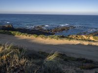 A summer day in Portugal reveals a coastal landscape along a road. The clear sky casts azure hues and shadows along the shoreline, while vegetation and mountain landforms line the horizon. The ocean and shore bring a tranquil atmosphere to the grass-covered plain.