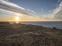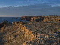 The sun rises over a beautiful Portuguese coastline, illuminating the cloud, sky, and azure water. The terrain of the cliff, bluff, and shore is visible, as well as the vegetation of trees, grass, and rocks. The atmosphere of the natural environment is peaceful and serene as the sunlight reflects off the water resources.