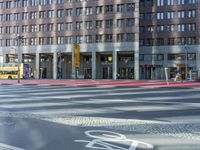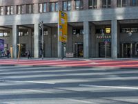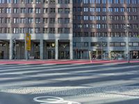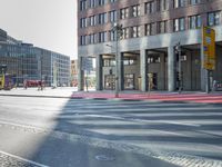 The modern architecture of the mixed-use neighborhood of Potsdamer Platz in Berlin, Germany is visible on a bright day, with the town's infrastructure and public space creating a hard shadow on the asphalt road and pedestrian crosswalk. Tourists and locals alike use the urban transport and cross the residential area, condominiums, and facades, creating a profile of the metropolitan area of Europe.
