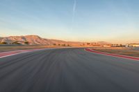 A winding race track curves through the hard shadows of dawn in the USA, stretching straight down the road and disappearing into the clouds.