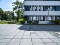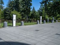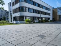 A recharging unit in a parking lot in Berlin's business district is silhouetted against a clear sky, with classic and modern architecture in the background. The hard shadows cast from the office buildings create a stark profile of the paver and charging station.