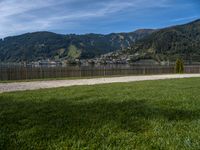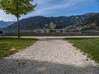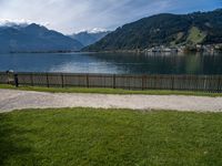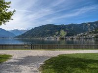 A landscape overview of Zell am See, Austria, with a glacial lake, mountain terrain, and a sunny day with a clear sky and cumulus clouds. The natural environment of grass, trees, and dirt, leads to an open space with a dirt road and a gravel path. Outdoor furniture, like a bench and fence, overlook the water resources and the azure horizon. This destination is perfect for recreation and relaxation.