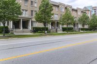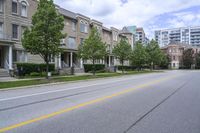 A straight road lined with yellow trees and residential buildings in Toronto, Canada.