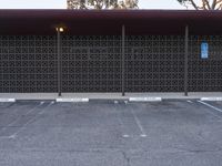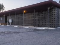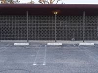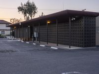 an empty parking lot with benches and plants on the side of it and buildings behind