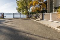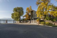 A beautiful residential home in Kelowna, British Columbia, Canada, surrounded by the vibrant colors of autumn. The asphalt road and concrete driveway lead to the house, with a clear blue sky and contrails in the background.
