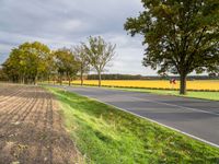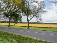 The tar-covered road surface stretches out in front of a lush, green European landscape. The autumn sun casts a warm light on the tree branches, grass, and asphalt as the road winds its way to the German city of Berlin.