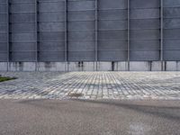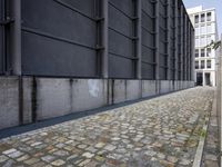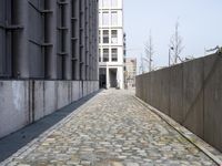 A view down a cobblestone alley-way in Berlin, Germany. Various composite materials such as asphalt, concrete, metal, and tile are used in the infrastructure and flooring. Symmetry is created by the pattern of the road surface, the door frames, and the walls.