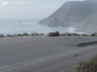 A view of the Pacific Coast Highway in California, USA, at dawn. The coastal landscape features a mix of recreational infrastructure, ocean shore, bluffs, beach, mountain landforms, beach sand, and mountain ranges, making for a beautiful and peaceful overview of the area.