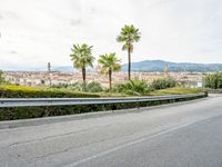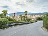 The winding asphalt road leads through the Tuscan landscape, straight down the road to the city of Florence in Italy, Europe. Nature and cityscape blend together in this tranquil day view.