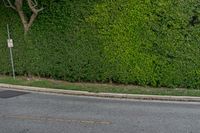 A scenic view of a road lined with hedges, grass, and trees in Los Angeles, California, USA. The road surface is smooth asphalt, and the vegetation is lush and green.